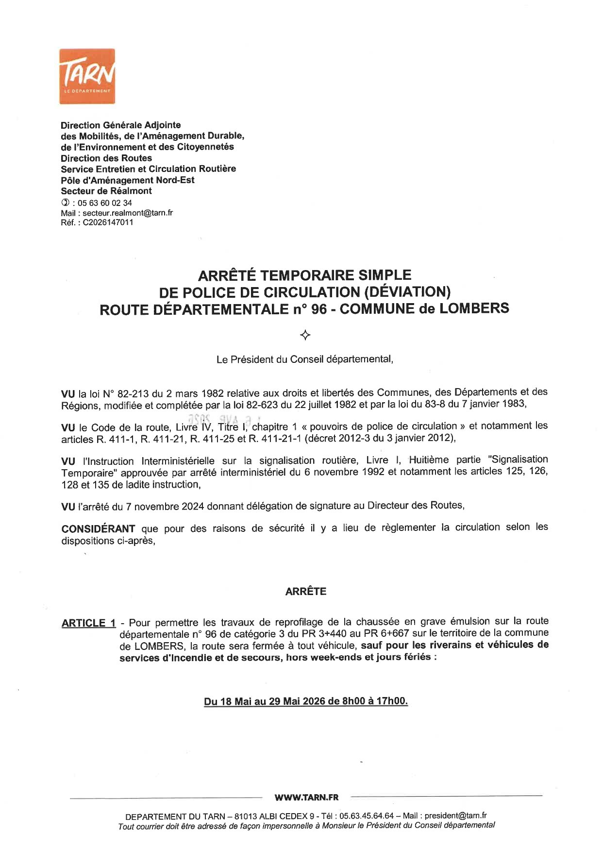 Pour permettre les travaux de reprofilage de la chaussée en grave émulsion sur la route départementale n° 96 de catégorie 3 du PR 3+440 au PR 6+667 sur le territoire de la commune de LOMBERS, la route sera fermée à tout véhicule, sauf pour les riverains et véhicules de services d'incendie et de secours, hors week-ends et jours fériés :