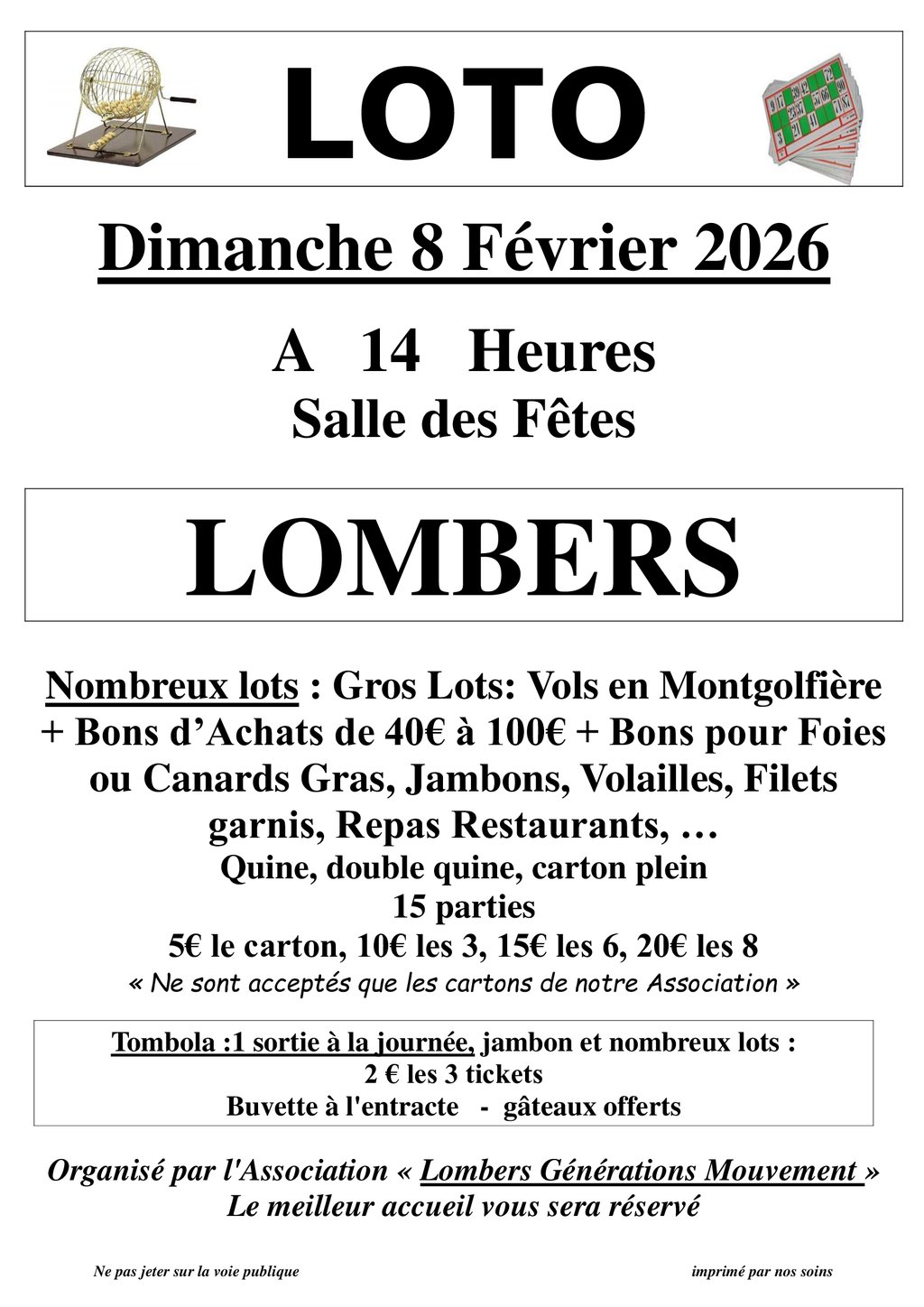 L'association "Lombers Générations Mouvement" vous présentent leurs Meilleurs Vœux pour 2026 et vous convient au traditionnel loto qui aura lieu :